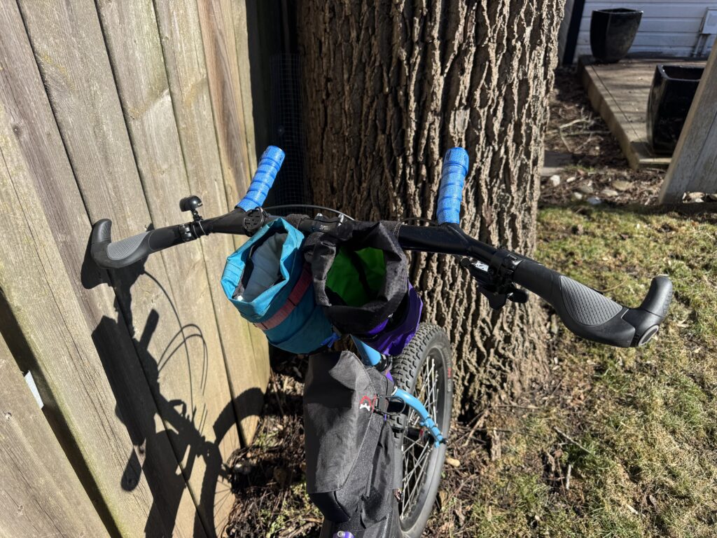 The frame’s narrow triangle is a bit unconventional, but there’s still loads of room for bags and water bottles. We’ve mixed and matched our bags based on what bags I already owned and a bit of creativity.