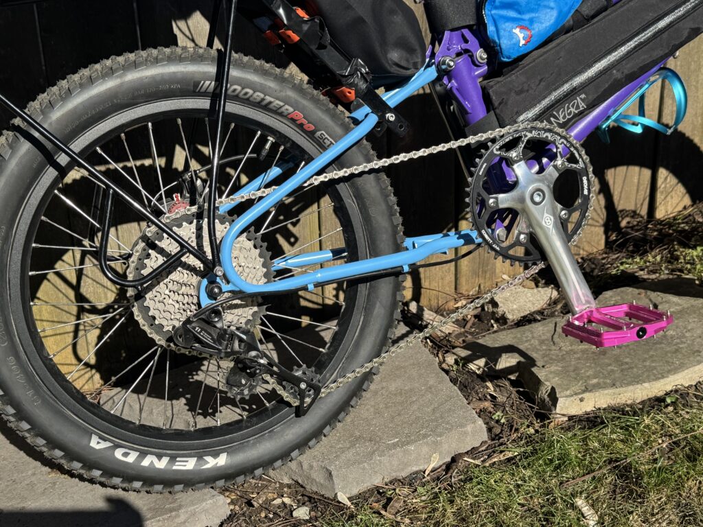 We spec’d our bike with a SRAM 1 x 11 drivetrain, 2.4” tires, a folding rear rack, and their ‘packalope’ handlebars (which split in two for travel).
