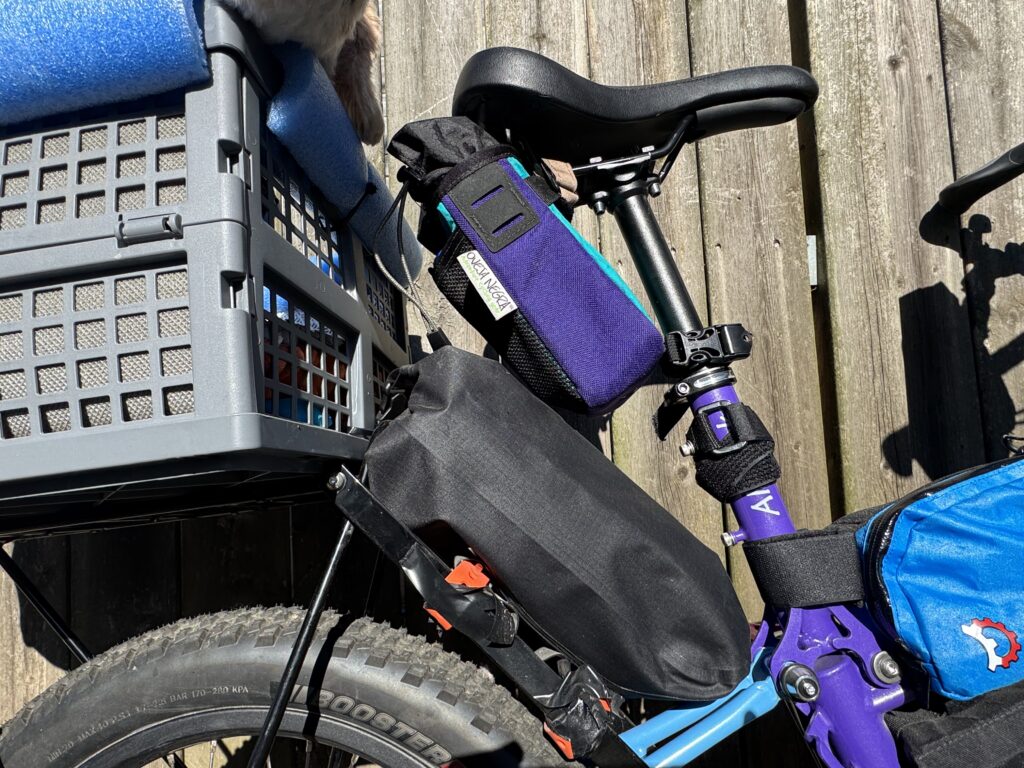 - Triangle: a ‘half” frame bag (it’s not custom, it just happens to fit). You can get a frame bag made from Take-a-Trip Bags or a custom frame bag from Blue Dingo Bagwerks.