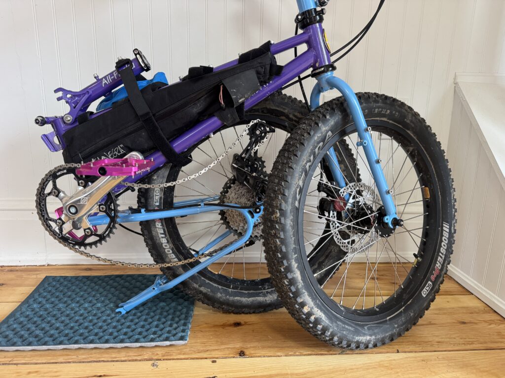 The All-Packa, their bikepacking off-road model with 20-inch wheels, interested River and me because of its capability of tackling mud, dirt, and gravel – the rims accommodate tires from 2.0-2.8 inches wide – yet the bike still fits in a standard suitcase for air travel. It’s tricky to find a bike that does a great job of balancing off-road performance and ease of packability. The All-Packa checked off this sweet-spot.