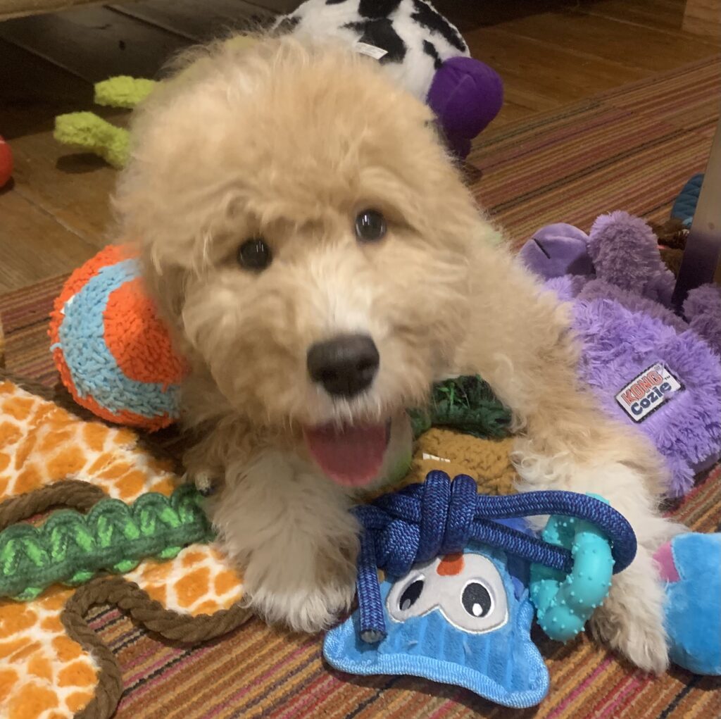 - Continue basic training: commands (sit, stand, come, “No”), some tricks