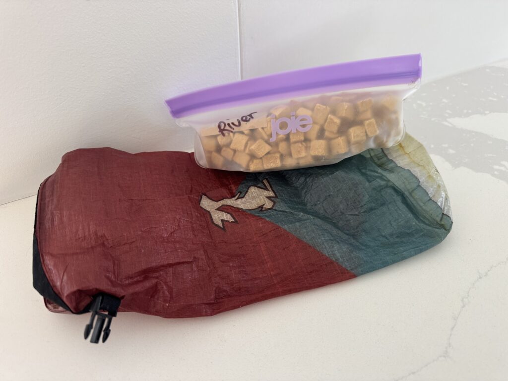 A regular deep clean is also a good idea for any dog kibble travel containers. Microscratches can easily occur to the lining and rancid fats can accumulate. On dogpacking trips, I keep River’s kibble in reusable and dishwasher-safe PEVA zip-top bags inside a rolled-up dry bag. This way, the kibble doesn’t directly contact the lining of the dry bag, and I give the Joie bags a deep clean (dishwasher-safe) before refilling them. I also place a packet of silica gel in each food bag to keep kibble dry.